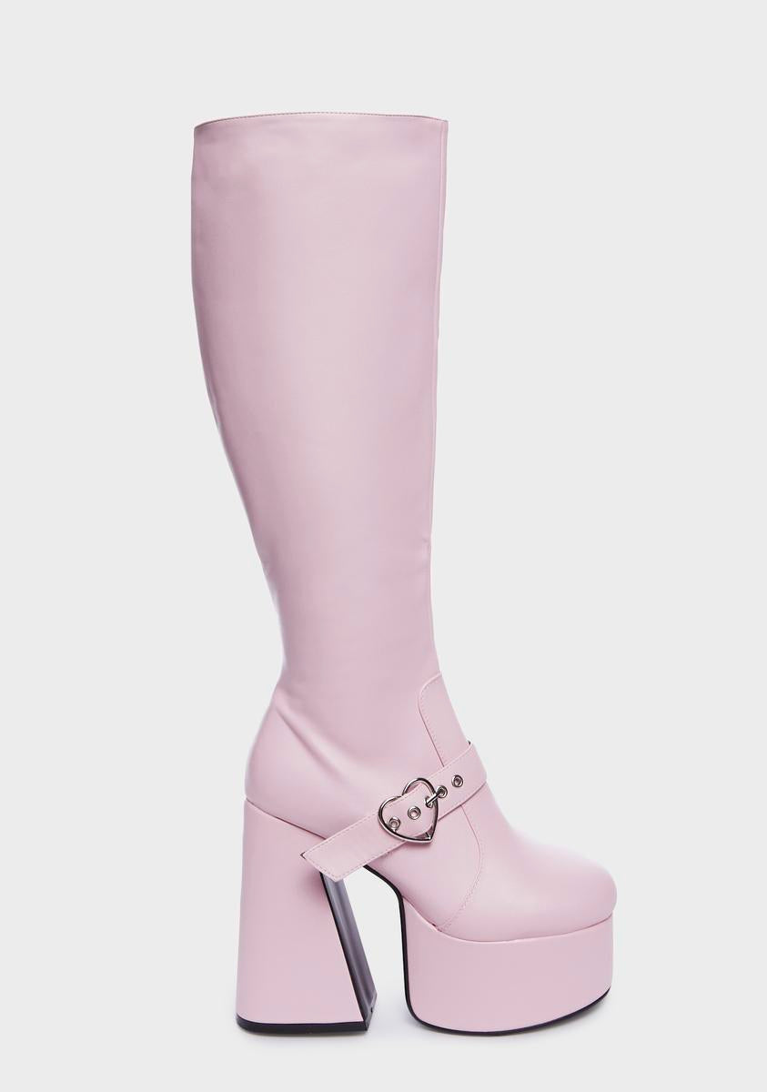 cuz you wear your heart on your sleeve. These wide fit platform boots have a wider foot and shaft design, a vegan leather construction, decorative vamp straps with buckle hardware, knee-high shafts, side zip closures, and flared block heels.