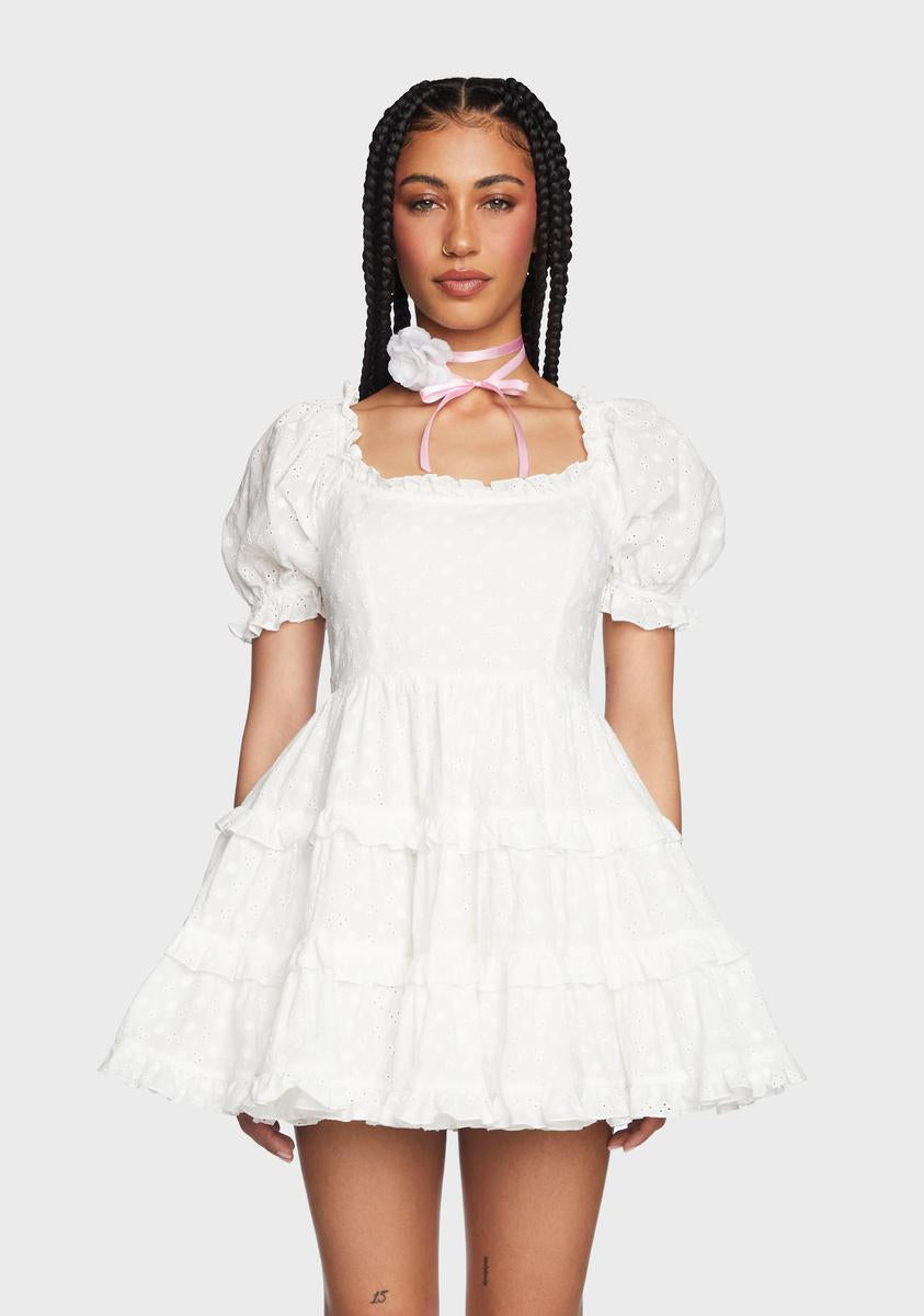 cuz make my day even better. This babydoll dress has an all over floral eyelet design, a square neckline, puffy sleeves, a tiered skirt, a ruffled trim, a satin ribbon lace up design on the back, and side zipper closures.