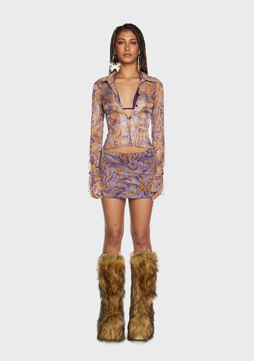 cuz be insta worthy! This skirt set includes a triangle bra top with halter neckline, a long sleeve top that has a shimmery ribbed construction, an all over marble print, a collared neckline, lettuce trim button cuffs, button front closures, and a m