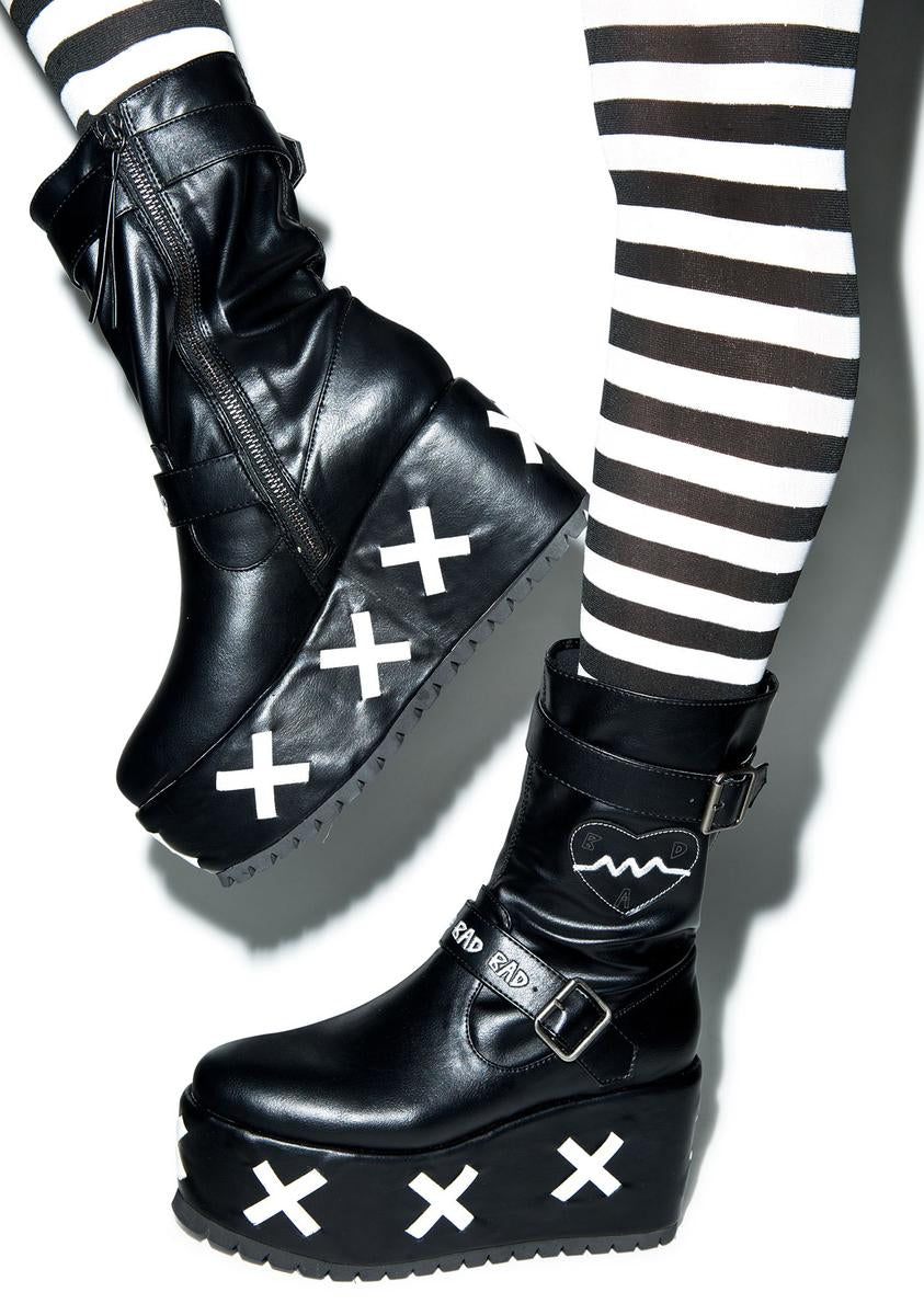 Y.R.U. x Chocomoo Yuka Platform Boots, is gonna stop a few heartz. These Bad as fukk platform boots are the love child of Y.R.U. and Japanese visual artists Chocomoo Yuka featuring two adjustable straps, and all over super soft vegan leather. Detailed with embroidered heartbeat hearts on the ankles, Bad Bad Bad across the front strap, and XXXs along the 3.5 inch platform, and treaded sole, so ya won����t trip. These BBz are limited addition, and won����t be around long, so show off yer art appreciation before the opportunity is gone for good.