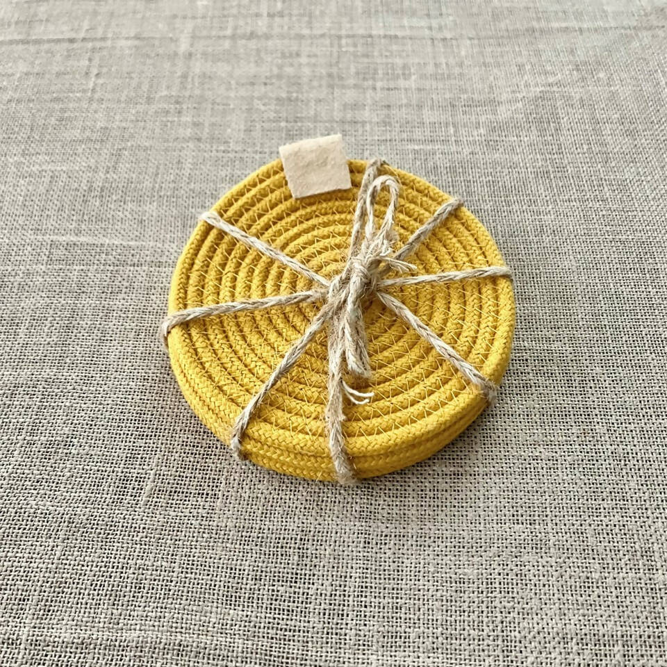 A set of 4 yellow cotton rope coasters. Each measures approximately 4 inches in diameter and is finished with a suede tab.