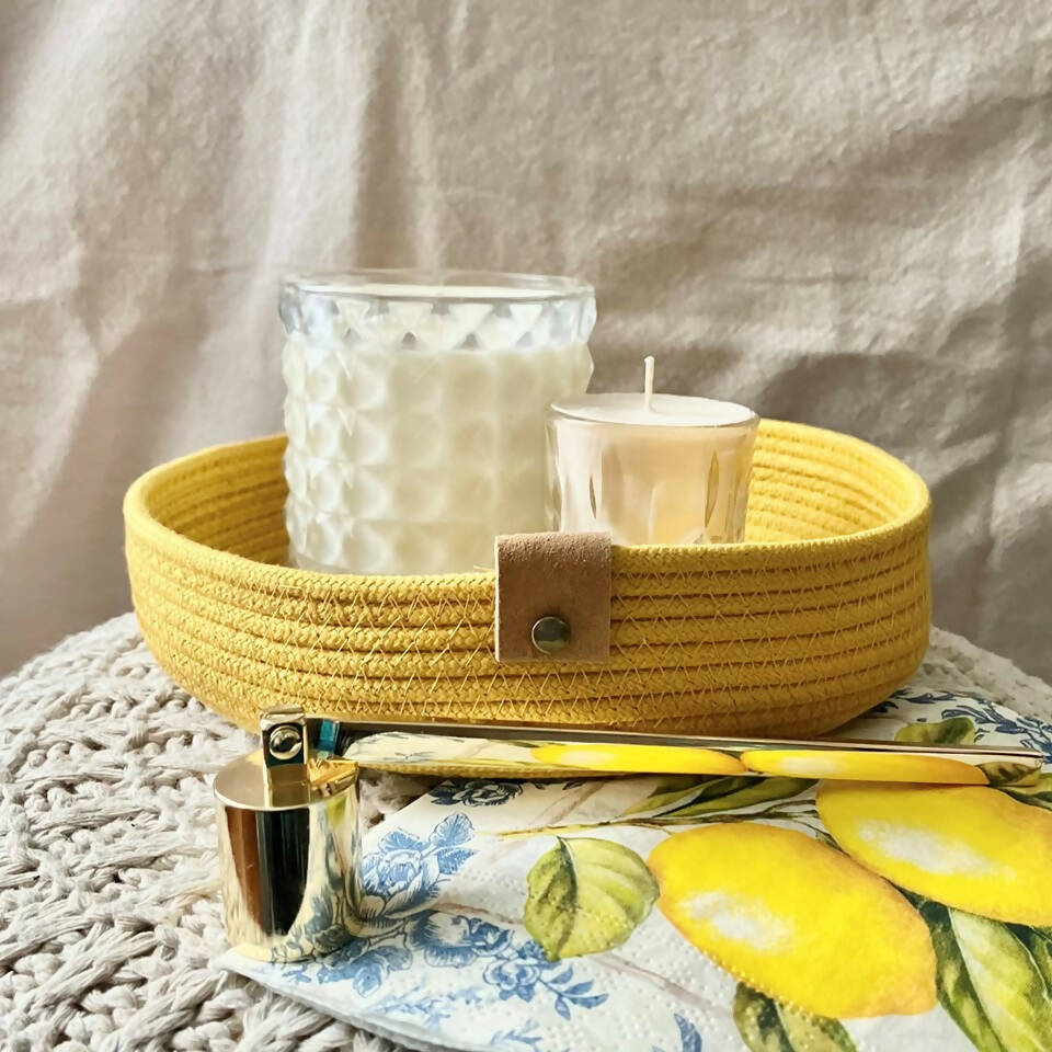 This rope tray makes a great home decor piece. Perfect for storing smaller items such as keys. Made with 100% cotton rope, this yellow rope tray measures approximately 7.5” in diameter across the top and is almost 2” high. Please note that each piece is unique in shape and design. Spot cleaning is only recommended since the rope will shrink if placed in hot water. Hard stains may be removed with a small amount of baking soda and warm water.